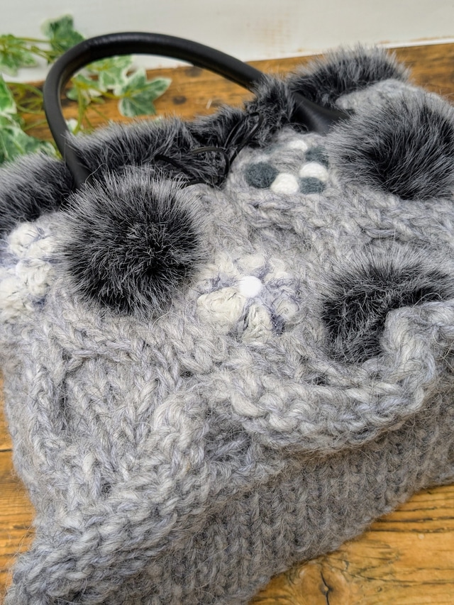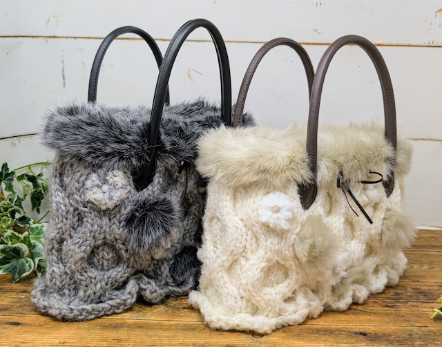 【素 材】バッグ本体:ウール100% 編み玉:ウール・ナイロンなど ファー:アクリル100% 持ち手:合成皮革