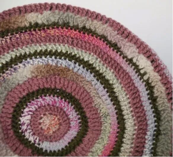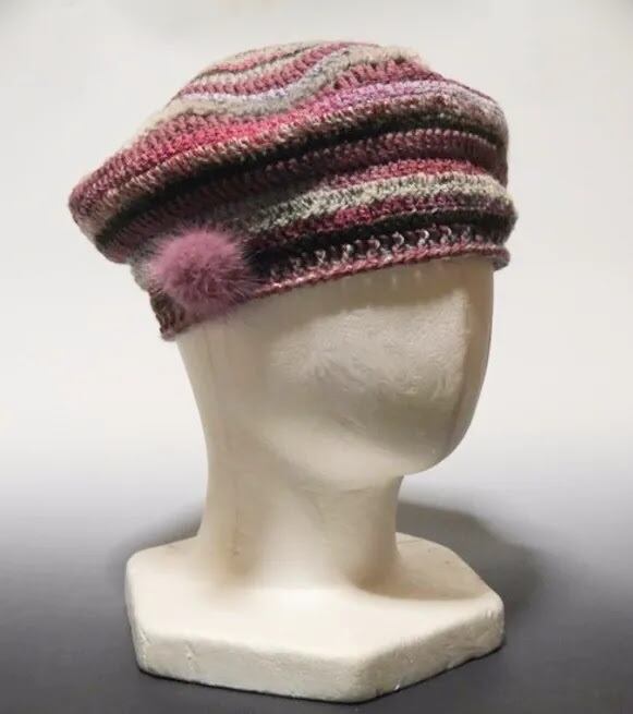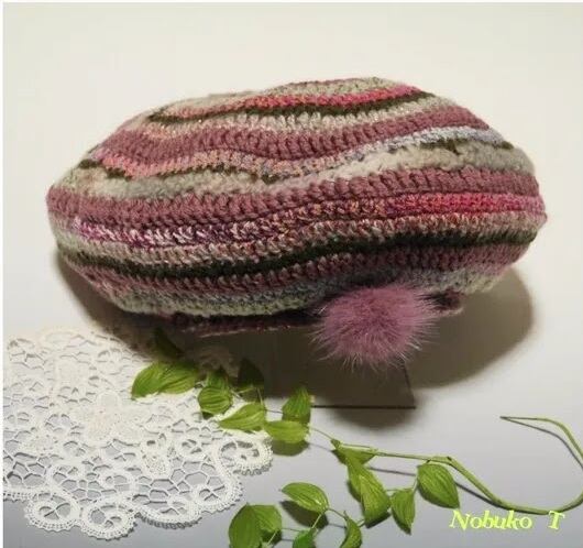 赤紫系の中細程度の太さの毛糸をランダムに使ってベレー帽を編みました。