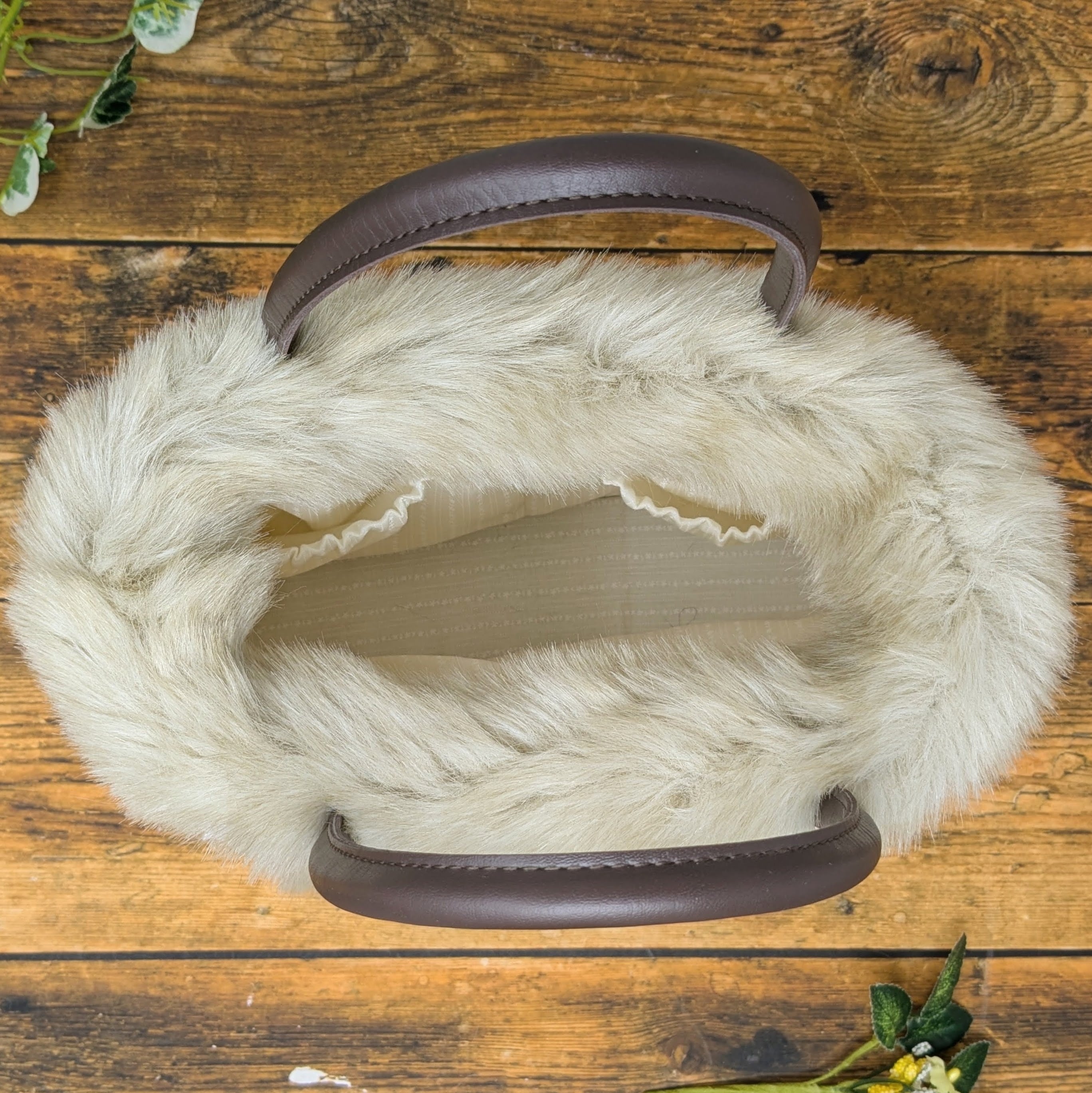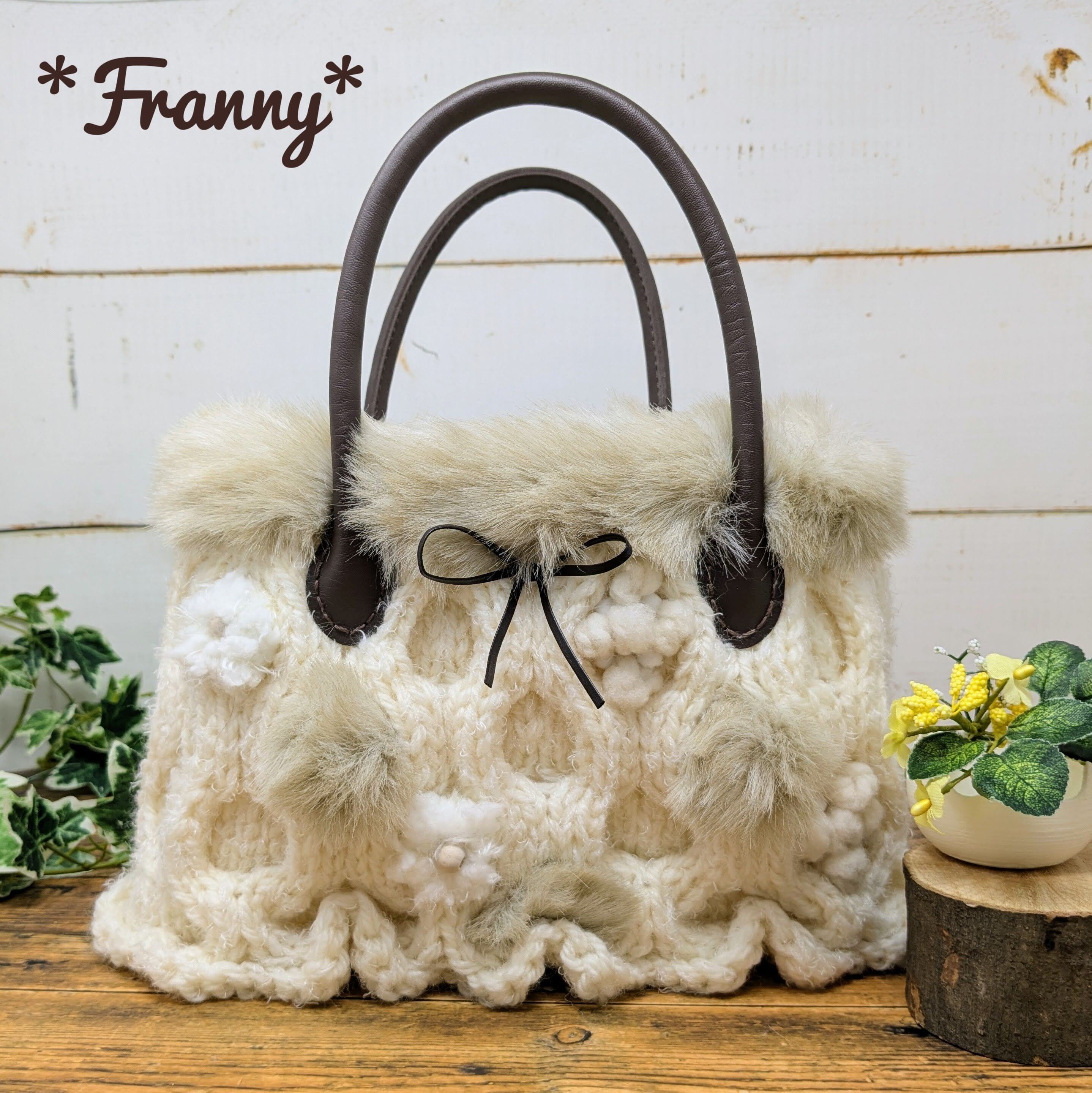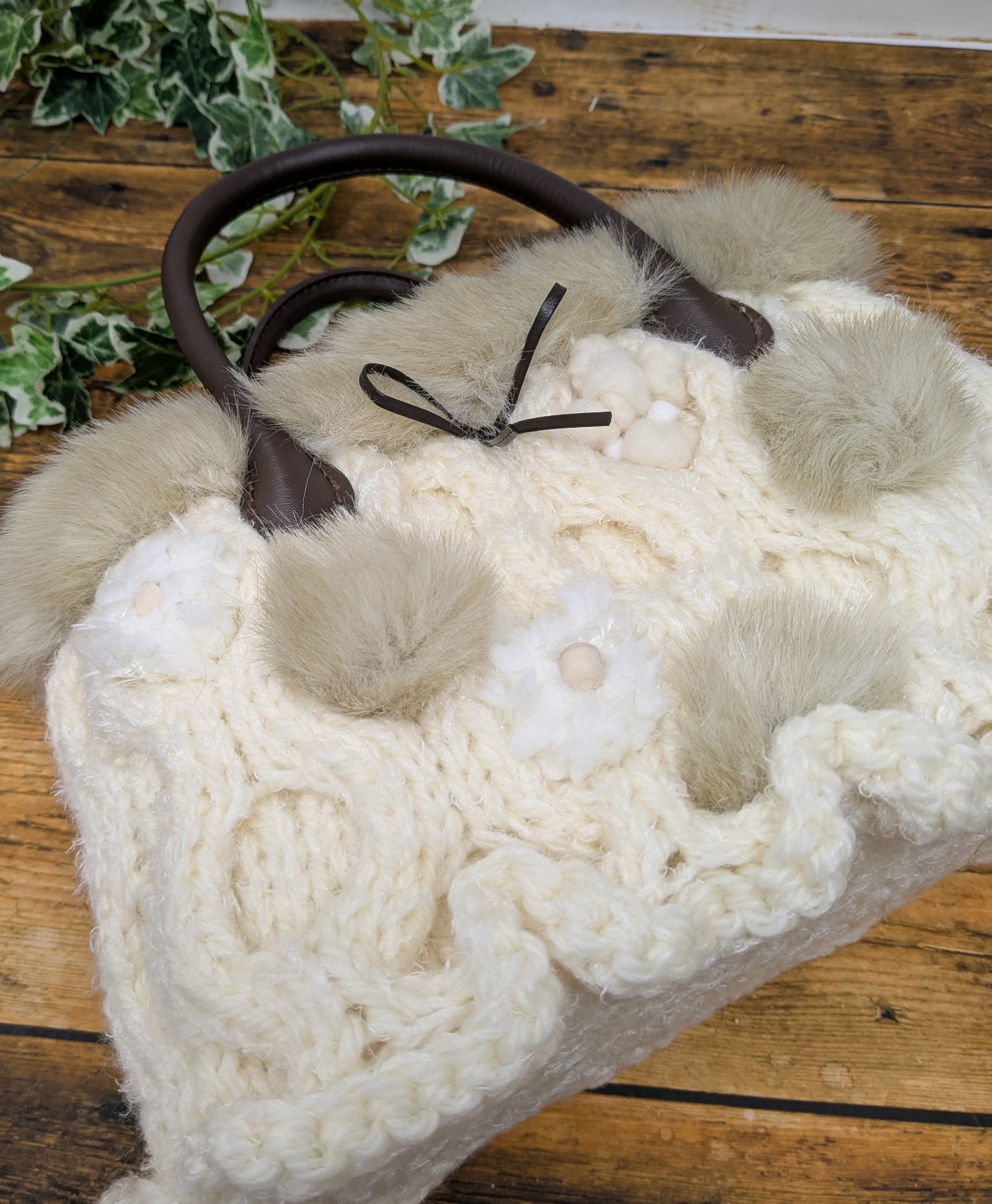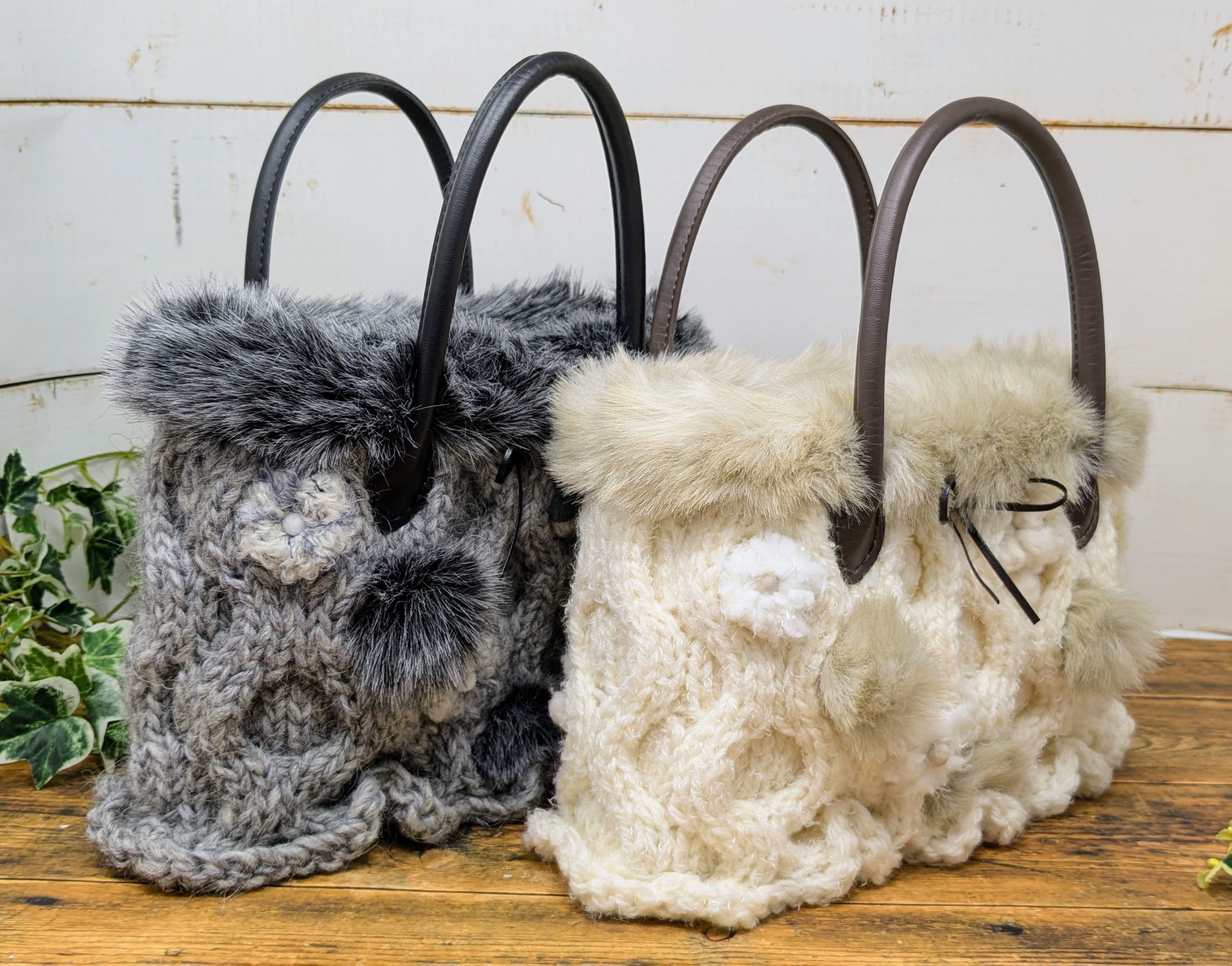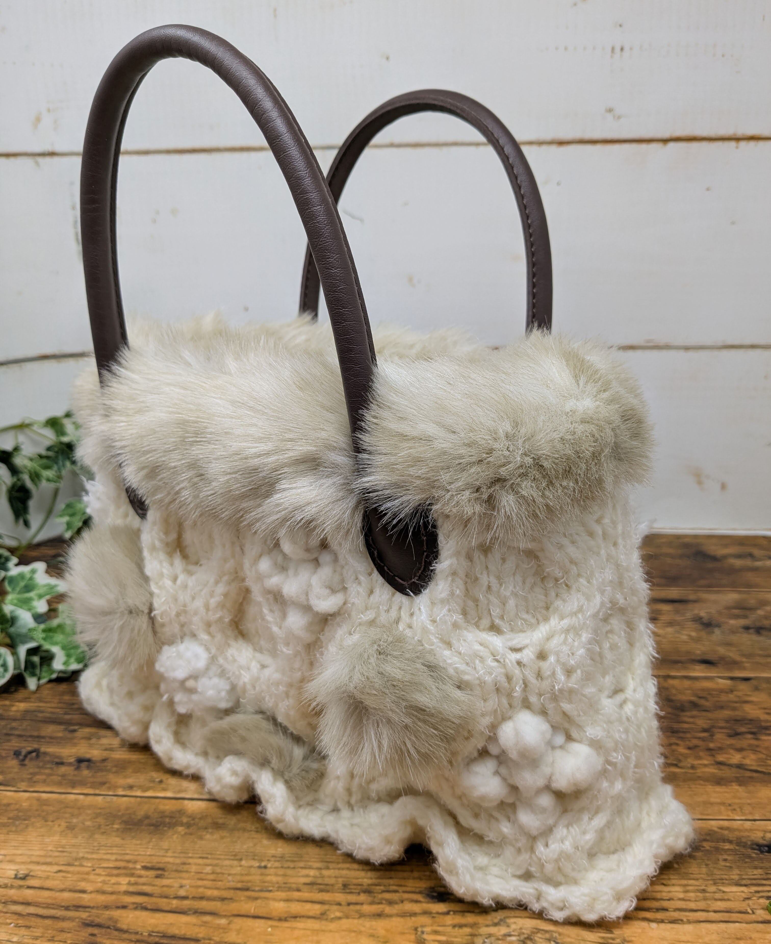【素 材】バッグ本体:ウール100% 編み玉:ウール・ナイロンなど ファー:アクリル100% 持ち手:合成皮革