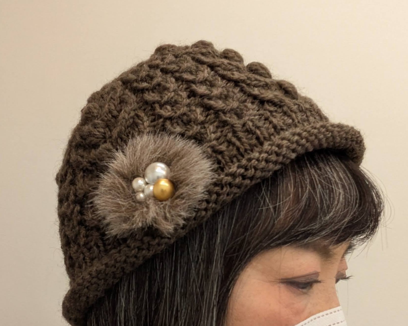 ファー飾り付き・アラン模様の帽子(ダークブラウン)